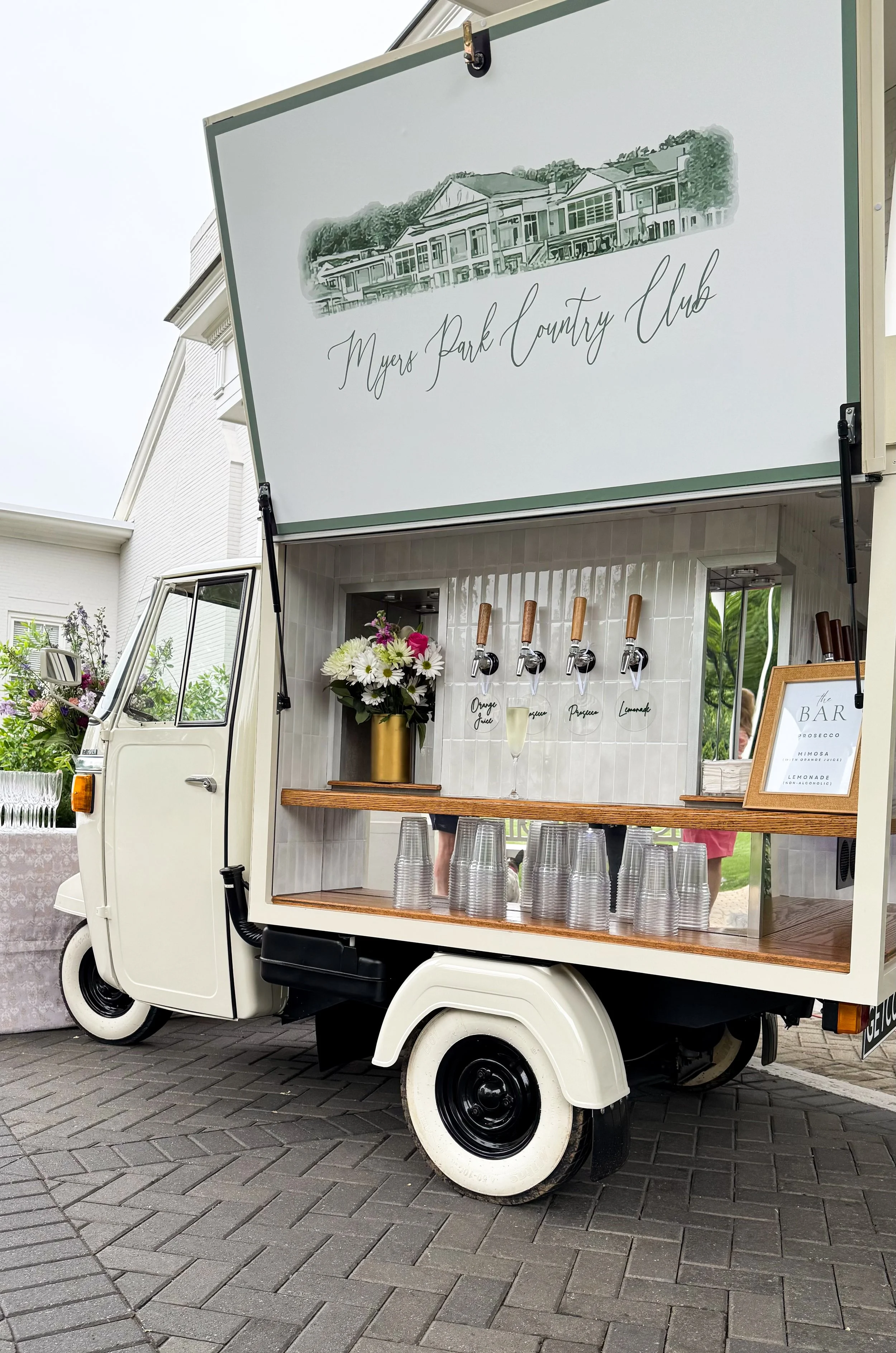 In Italian, “Ape” (pronounced AH-peh) means “bee.” The name reflects the vehicle’s small size, agility, and hardworking nature — perfect for navigating tight spaces and creating a warm, welcoming gathering point at any venue. Manufactured by the legendary Italian company Piaggio — also known for the iconic Vespa — the Ape is a beloved symbol of classic Italian design and everyday life. With its vintage charm, eye-catching aesthetic, and venue-friendly footprint, The Ape Bar becomes an instant focal point and photo backdrop at any celebration. Its compact size allows it to fit both indoor and outdoor venues while still making a big visual impact — ideal for everything from elegant weddings to upscale corporate gatherings.